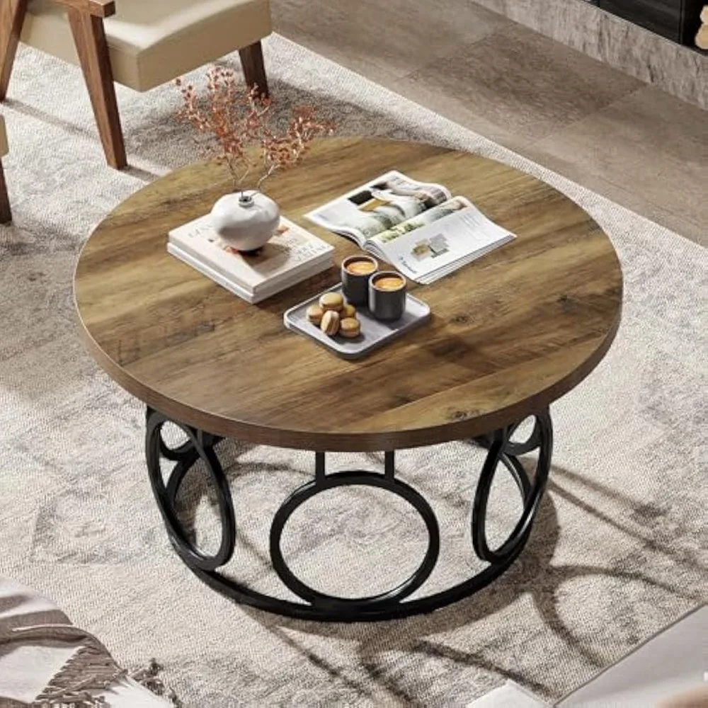 - Durable and Sturdy: The round wood coffee table features a hefty 1.18" thick tabletop. Paired with a black metal base made up of interlinked rings that are artfully arranged, it has a rock-solid structure. It provides reliable and long-lasting support for your home life